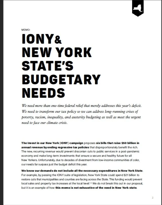 The Invest in Our New York Campaign is a legislative effort to pass the Invest In Our New York Act: a package of six state bills that raises more than $50 billion to ensure we can take care of each other and rebuild our economy by ending tax breaks for the richest New Yorkers.